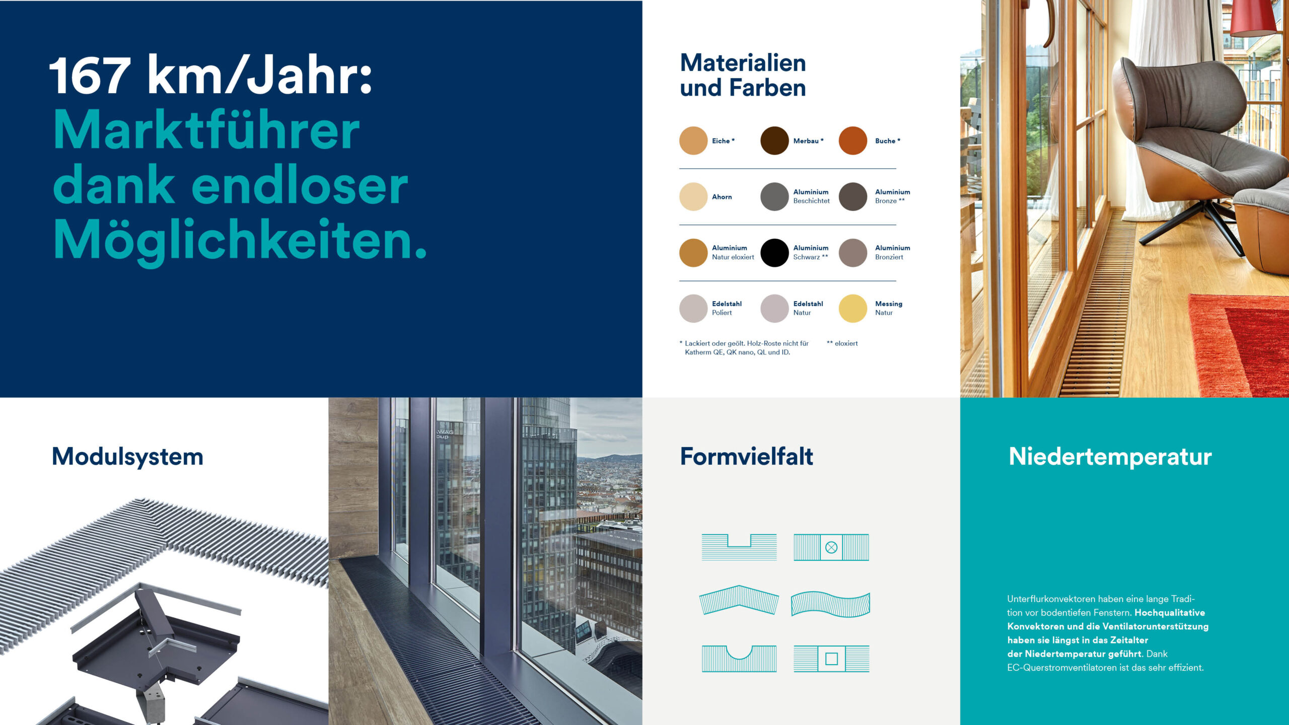 Kampmann hat den Anspruch, sich in einem konservativen Ingenieursmarkt modern und visuell abwechslungsreicher zu präsentieren – und trotzdem die Verlässlichkeit und Präzision zu repräsentieren, die seine Produkte auszeichnen. Gleichzeitig erforderte ein Digital-First-Ansatz ein System, das zwischen modernen Interfaces und klassischen Print-Medien gleichermaßen funktioniert. Die Lösung war ein Design Refresh, das diese Anforderungen vereint: ein modulares System, das in seiner Logik konsequent auf zukünftige Anforderungen ausgerichtet ist.